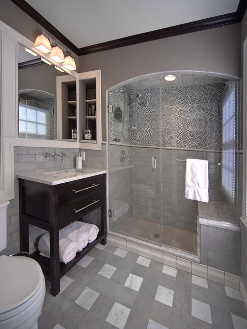 This is an example of a traditional master bathroom in Columbus with a console sink, yellow walls, white tile, a two-piece toilet and an alcove shower. — Houzz