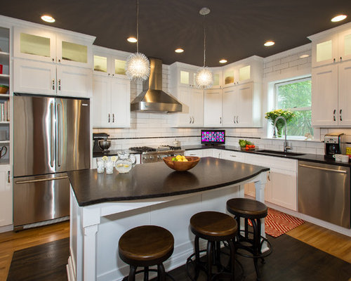 Mid-sized traditional l-shaped enclosed kitchen in Columbus with shaker cabinets, white cabinets, white backsplash, subway tile backsplash, stainless steel appliances, an undermount sink, granite countertops, medium tone hardwood floors and an island. — Houzz