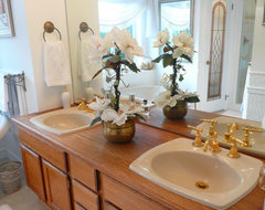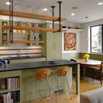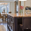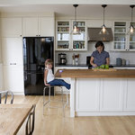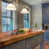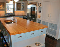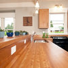 Here, an extra-wide wood counter makes for a wonderfully substantial island- big enough for an extra sink.
