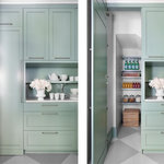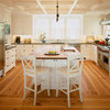 A wood-topped island and mis-matched barstools make for a showstopping focal point in this pretty kitchen.