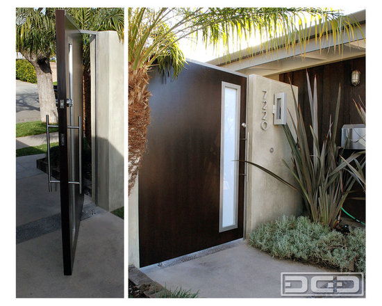 This Modern Ranch Style courtyard was fitted with a custom designed swiveling gate that followed the original designer's minimalistic style. Although large, this modern gate gives the impression of a lightly refined design that is reminiscent of Cliff May's Modern Ranch style architecture. Focusing on simplicity and the already fine-lines of this home we created a modern styl...More