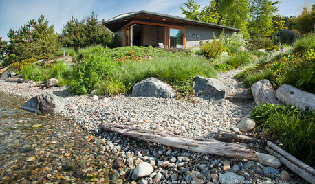 Meadow grasses, beach pebbles and driftwood replace turfgrass in a nature-friendly landscape on Lake Washington’s shore