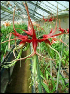 As if it were a hint of the fate, some hours after I wrote my "identification message" above, I went to the local supermarket, which has a floral department at its front, and I inspected their offers as usual and, what did I find... one potted Reggae plant which had just opened the flowers on the first scape. I had never seen one before except on photos, but I recognized it, instantly. What a brilliant, deep ruby red! (Not the burgundy red of H.papilio) The intense color being sharply cut in the lower half of the flowers and replaced by a pale green. I must admit that I HAD seen this plant and another potted cybister there one week before, both carrying green buds, but they were tagged with an incorrect label which displayed a pale bloom of a cybister HYBRID...