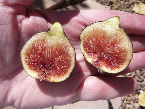 I'm not sure how cold hardy it is. It has always been in a container and stored for the winter. This year, I root-pruned it and planted it in the ground. It will be interesting to see if anyone else has this same fig. Ed: Thanks. Some of the first figs this tree produced were quite large and dark purple (almost black). I wanted to contrast a red and a blue fig and that's why I included the Palermo variety in the photo.