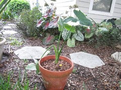I keep my Mickey Mouse Taro in pots. It likes to go out the holes in the bottom of the pots and start new plants all over the place lol. It is definitely the cutest EE !! I saw some at the Ace Hardware in Mandarin that were obviously MM taro but they had them labeled as "Variegated Sting Ray" and a big "WOW!!" marked on the sign in front of them. Reminds me of the ebay seller ads. That Ace is normally a great place to find unusual things (in their gh) so I was kinda surprised at the mislabeling.