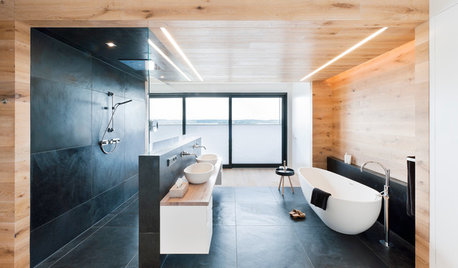In these fantasy baths, open designs let in natural light and views, and intriguing materials create drama