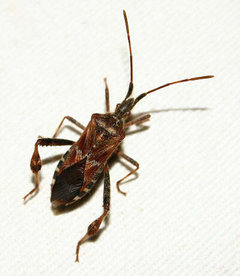 These look some what like the ones I see, only these are darker like the squash bugs, and have the black knots on their hind legs. If they are mashed the smell much like the squash bugs. They look different from a squash bug only with the long hind legs kind of like a spider or the wheel bug but have the sack or knot just above the hock on their back legs. Thank you for trying to help.