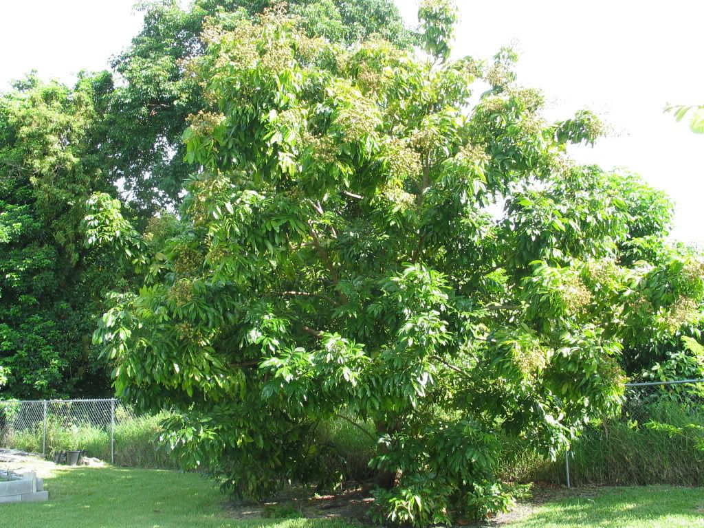 I didn't take a picture of the hanging clusters of fruit in early August, but suffice it to say that there were 10 pound clusters of fruit hanging heavily on the end of virtually each and every branch. The fruits were nicely flavored and very sweet. There was not a great flesh to seed ratio, however, and I am not sure if that was becuase of the characteristic of this particular tree or whether the heavy clustering limited the flesh production. I will try next year to thin out the clusters by hand to see if i can get the fruit to size up more and give a better ratio of flesh to seed. In any case, having it fruit for the first time was very exhilarating. BTW, this tree was totally blown over and uprooted by Hurricane Wilma in 2005 and so there was some major limb damage that has kept the tree somewhat manageable in size. For perspective, that is a 5 foot tall chain link fence between the tree. Good luck with your young seedlings.