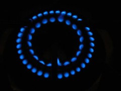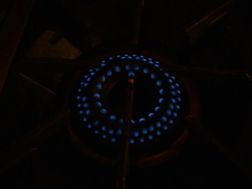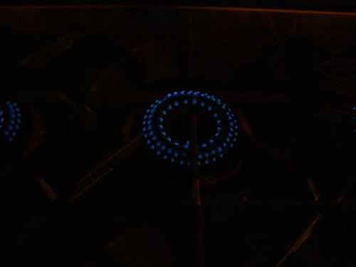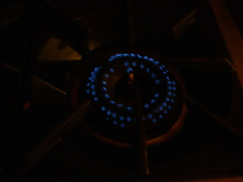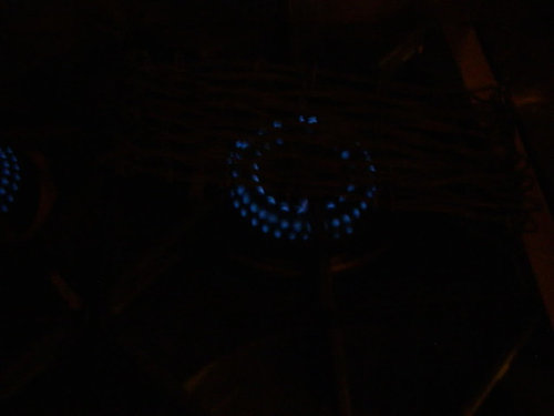 Here are pictures of all six of my burners on simmer with the lights out, plus one of the homemade "comal" dh fashioned of scrap copper wire.