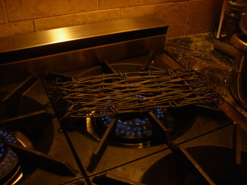And now, I think I'm back up to speed in the cooking department, so it's time to address this simmering issue. I was bemused to note the problem still being kicked about here on the appliance forum; I haven't visited here for a long while. But clearly operator-error or no, this continues to be an issue for some. Don't know the denominator -- maybe thousands out there have no problems at all. But when dh presented me, proudly, with his homemade copper-wire disperser I was just so *embarrassed* that the machine I'd garnered so many thousands of his hard-earned income for, needed that sort of fix. I hadn't even mentioned any problem to him whatsoever, but I guess it was sort of obvious.