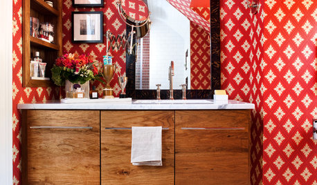 Daring red wallpaper and asymmetry put a small, outdated bathroom on the path to memorable