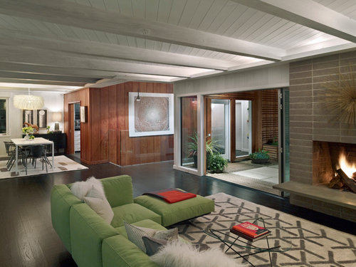 Forays into antiques markets and online auctions bring old-time flavor to a sleek and soaring living-dining space