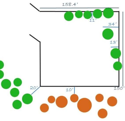 The lot with native ever green and deciduous trees along or outside property lines (green color=evergreen; orange=deciduous)