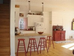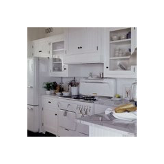 Here you go - this is Layla's DIY remodeled kitchen (Lettered Cottage). The beadboard is also white and the walls are a very pale aqua shade. More of a cottagey look.