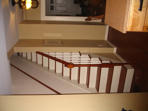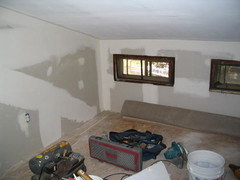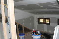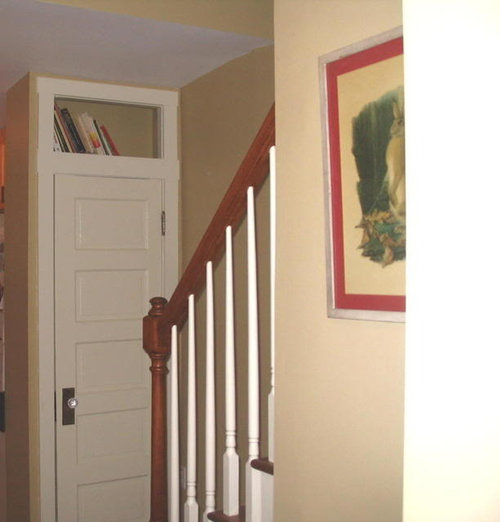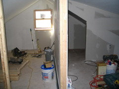Towards stairs (after work had started -where that door is in this picture is where the banister attaches to the wall, below! Yes, the old stairs were THAT steep):