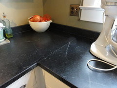 Walnut countertops join hardwood floors and pieces made from leftover framing in a bright Spanish colonial