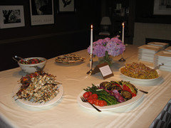 Are your caterers going to help you serve the food they didn't make? I'm trying to think of things that will take little effort on your part the day of the party. Fruit and cheese trays?