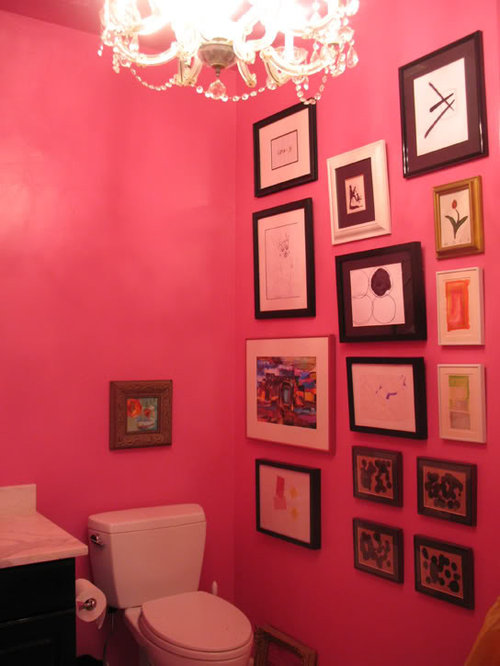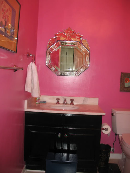 I LOVE pink. I mean I love love love pink, esp. raspberry / hot pink. Because this powder room (which also has a huge shower, home to the kitty litter, thankfully not pictured) is an interior room and totally separate (vice most of this "open plan" house) I knew I could have tons of fun in there. I did!!!