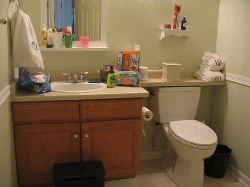 First, I painted the builder’s-grade oak vanity a high-gloss oil-based black; I had the paint left over from our front door. We had an electrician come and move the junction from the wall (above the mirror) to the ceiling. Next I smooth-coated the walls (and patched the electrician’s work). The walls / ceiling were that knock-down finish and with apologies to all who like it I hate it. Hate hate hate knock-down texture. I hate it more than the inflamed tendonitis from smooth-coating all those farchadat angles and ceiling in there! Man was my hand swollen when I did that work but it was so worth it! (We’d had the rest of our house plastered after we bought the house three years ago except for this bathroom and the laundry room: we were toilet-training using this bathroom and the laundry room had the changing table [for our younger child], so we really needed access to both of those spaces all the time. Know what I mean?)