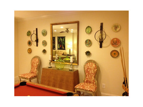 So I am waiting for nine more prints to arrive from Empirical Style in Australia, and the rest of the majolica to arrive (bought some at Scott's Antiques and have others coming from ebay purchase to hang on outside aspect of sconces over console).