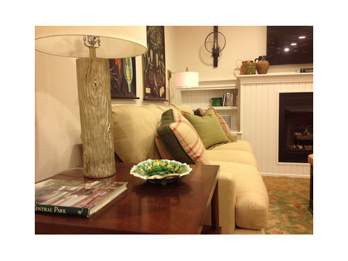 And since original pix were taken, cocktail table has been replaced by two small, cute leather ottomans, one with a bronze gallery tray: