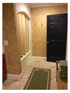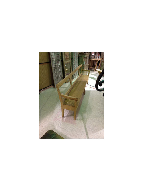 Very successful couple of days, very tired, some mishaps... Furniture arrived early, Microseal arrived late, so furniture, rugs, pillows and pool table will be treated Tuesday. Still need to take light off one ceiling fan but couldn't find disk that caps it off. Bathroom needs a bit more tile, the paneled tub surround (cabinetmaker made to match fireplace paneling) needs trim and Azek tub edge needs paint, still looking for antiqued or satin brass faucet and taps, still waiting for shower curtain, ID wants wants wallpaper in bathroom, and am considering buying this Swedish 8 ft bench for towels, basket of toiletries, etc. It has original finish from 1870s but I want a milk paint /waxed look.
