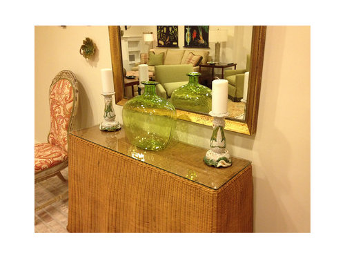 Closer: rattan console with candlesticks and a glass vase purchased for the room