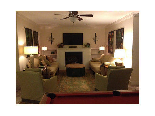 Head on fireplace from pool table (this is dark because we need dimmers for all lights, even sconces are too bright!)