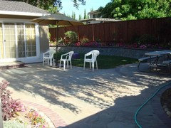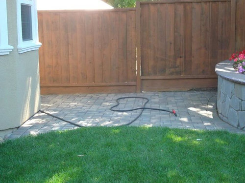 Paver area on far side we were thinking of putting in the patio swing which my DDs will enjoy lounging and reading. This is separated from the main patio by section of grass and far away from house entry, but is shady here in the middle part of the day due to neighbor's large tree on other side of the fence. I do need to soften the fence look so probably add a couple of planters to either side of the swing and/or small side table.