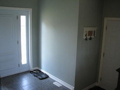 {{!gwi}}Library/foyer, 12x17 (including foyer) BM Boardwalk. Not really working out to be my favorite color and I hate this flat paint but DH would kill me if I asked him to repaint. Ignore my nightstands, that's the safest place for them until the bedroom is done. The curtains aren't really that pink, either.