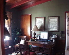 Since the living, dining and master bedroom get a major amount of afternoon light, we used what I call "sunset colors".....a deep gold faux in the bedroom, gold in the living room and burgandy in the dining room. Both rooms have creamy light gold trim. The den, warmly panelled in pine wainscotting with a matching ceiling got painted a deep olive with Eddie Bauer Cabin Red trim and beams. The kitchen went light olive when we renovated, and the attached "utility room" became our coffee bar/laundry/powder room area and got painted a gold faux. The guest room is a light buttery yellow with black and red accents.