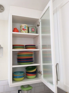 advice please for colorful "dishes" for open white shelving
