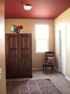 Indigo walls and woodwork, textured furnishings, task lighting and a media center turn a neglected room into a family hangout