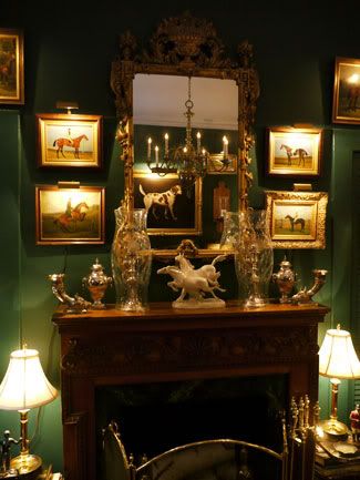 Silver stirrup cups flank a pair of crystal hurricane lamps atop the carved mantel. The delicate porcelain horses are from Germany.