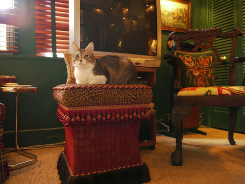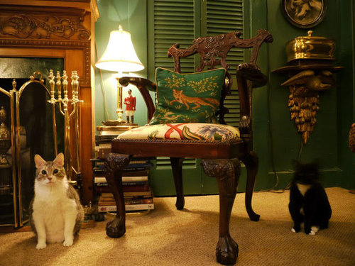 Baby, a rescue cat, sitting next to a Chinese Chippendale chair.
