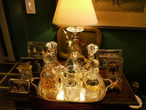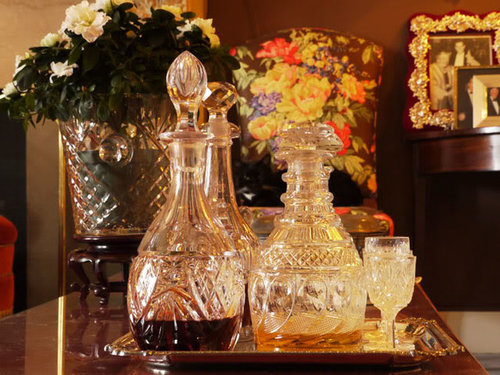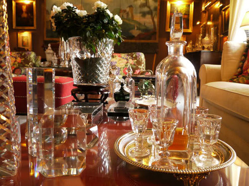 Cut crystal objects and decanters cover the red lacquer coffee table.