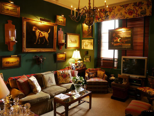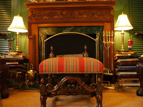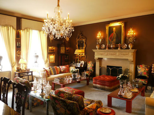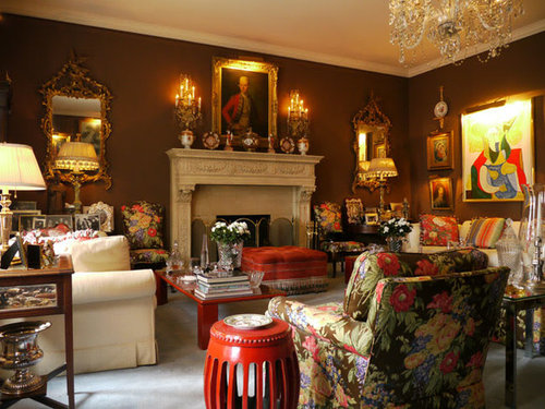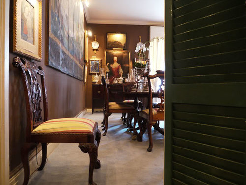 An oil portrait of the cousin of the Duke of Marlborough by artist, Sir Geoffrey Kneller hangs above the massive fireplace mantel. Chocolate brown walls are the perfect backdrop for Dick and Rod�s grand living room.