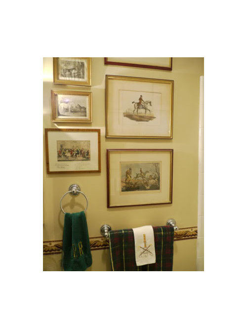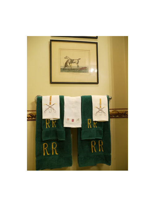 The guest bathroom with its laundered foxhunt-motif towels.