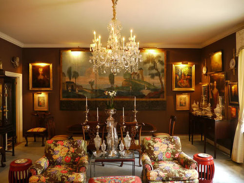A two-tiered crystal chandelier purchased in London hangs above the mahogany dining table.