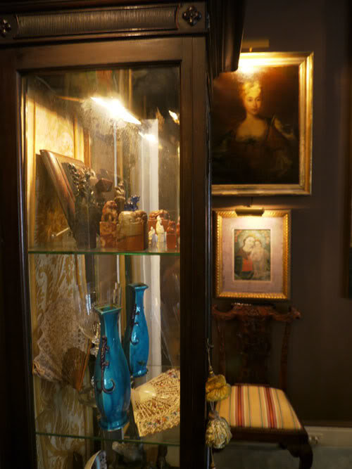 A Chinese Chippendale vitrine is filled with jade Chinese stamps, lace fans and peacock-blue porcelain vases.