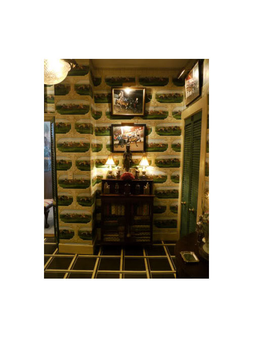 competitions line the walls of the front entrance hall. Peeking into the front entrance hall with its equestrian-themed wallpaper purchased in the early 1990s from Twig.