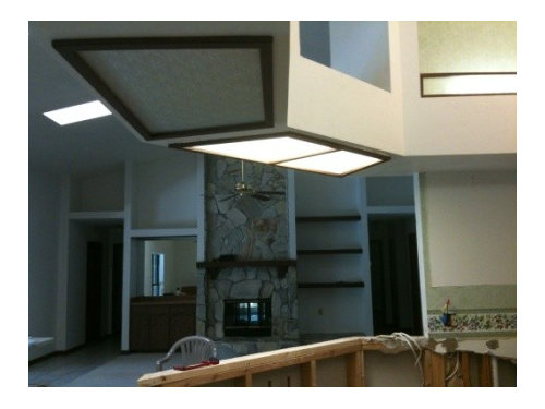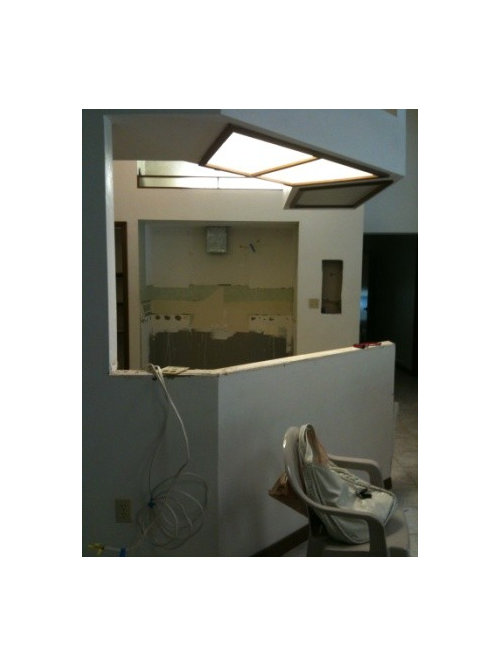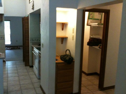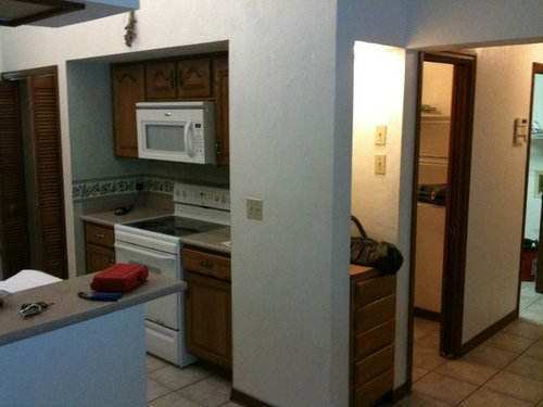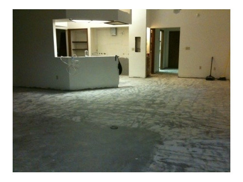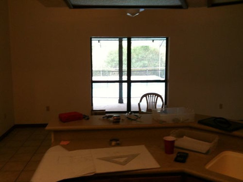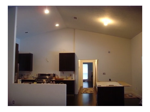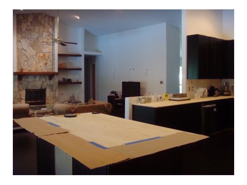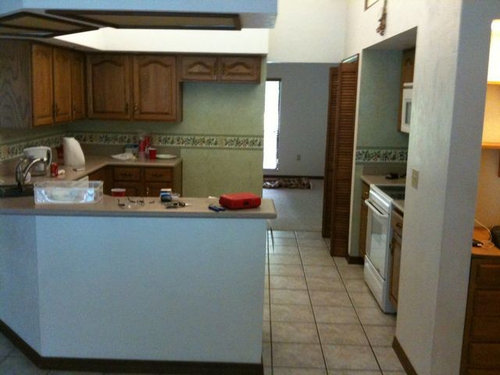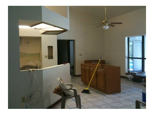 Please excuse all the mess, the stain on the bottom of the island cabinet, the old couches, the painted closet doors in the foyer, the plywood counters, etc.