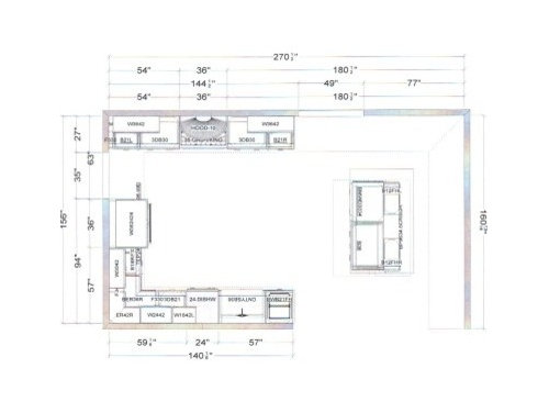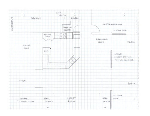We had plumbing restrictions because we're on a cement slab and would've had to trench over 5 ft to get plumbing to the island. And we had venting restrictions because of our vaulted ceilings and crazy things going on in the attic. So, pretty much appliances were going to stay in the same general areas as the previous floorplan. We also couldn't bump the kitchen out any wider because part of the wall behind the stove is structural with the garage on the other side and I wouldn't accept bumping the kitchen out in the other direction, towards the great room, because then the kitchen would've been straight in the line of sight from the front door, which bothers me in a way I can't quite express.