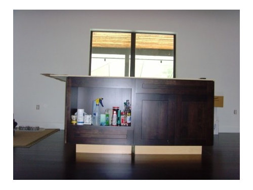 We're saving this spot next to the island and "poopis station" (again, his term...sorry, we call the dog and cat poopises) for some kind of hutch or beverage station, but after final placement of the island I think the deepest we can go is 18" and that's not enough for a beverage fridge.