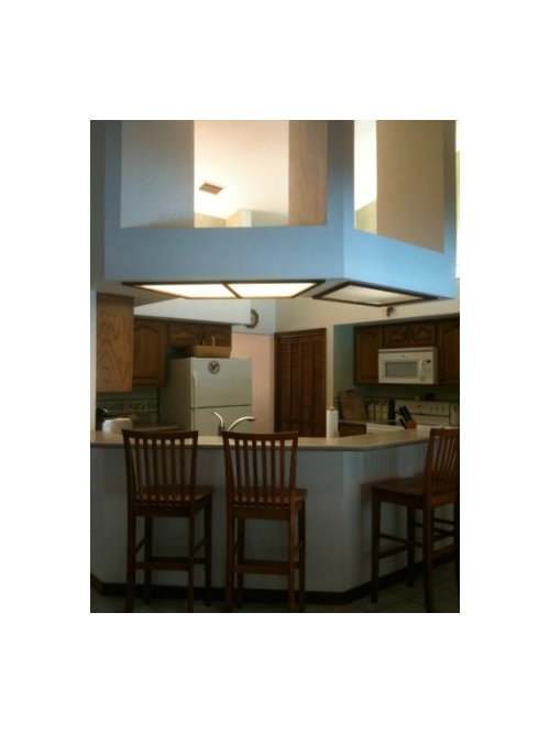 Okay, so we absolutely hated the soffits and knew those had to go because why would you put in soffits when you have these gorgeous high ceilings?! We also didn't like how the angled bar made the kitchen feel very closed in, so our goal was to some how incorporate the breakfast area into the kitchen and make it a bigger, cohesive space. The problem was we had a walkway running in between the two areas from the garage/laundry/office/master bedroom hall to the main part of the house kitchen/greatroom.