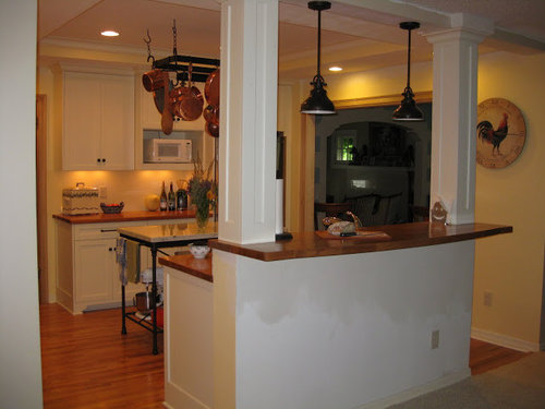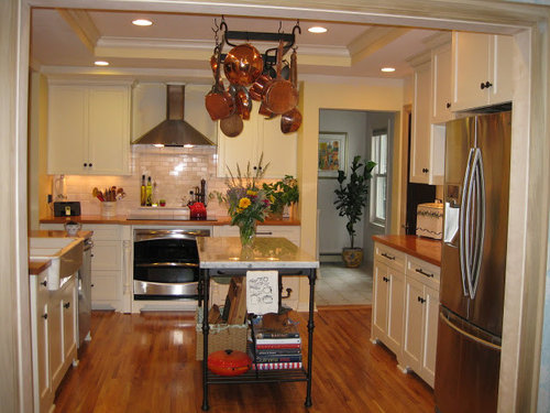 Finished: Traditional with copper pots, marble table, wood ctops