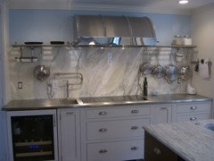 bmorepanic -- oops -- haha, yes, I need to explain. I don't mean MY lunch, I mean making the kids' lunches in the a.m. while someone else is trying to get breakfast together. Right now every single thing that happens with food (other than actually standing at the stove to cook) happens in that little corner between the sink and fridge. It was fine when DH was single (he designed the current layout) but it is not working as well for a family. It is also very difficult to have the children help me prep because of that tight corner. On thinking about it more, I am not sure I'd ever do much major prepping over by the stove in my "simpler" layout if I had a sink there -- I'd have to have double sets of prep utensils for one thing, because it is so convenient to prep between the fridge and big sink for everything that's not going on the stovetop. But it would be nice to have a sink there to fill and empty pots and wash out the cast iron and that sort of thing, as plllog said.