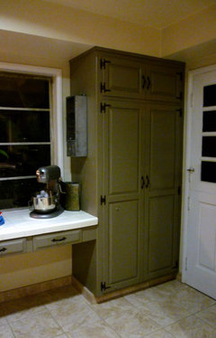 *Also, we don't use the desk for anything - other than piling up my purse, mail, and other sundry nonsense - so I'm thinking I'd like to put cabinets there and make it another workspace; however, the window is a problem . . . it's exactly the height of the desktop and if we get into windows it adds another dimension to all of this because our town requires drawings, etc. for any window changes on the front side of the house. As I type this I can hear the cha-ching of California cash registers aka the gaping maw of overpriced everything (I'm originally from the Midwest).