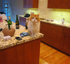 My cat loves the island too. That's his sink. He's old (17.5) and in declining health so I put up with him being on there (next kitty won't be so privileged). Needs to drink a lot of liquid and gets a lot more from the faucet than from a bowl. Here he is during construction.