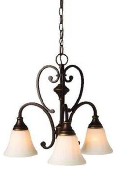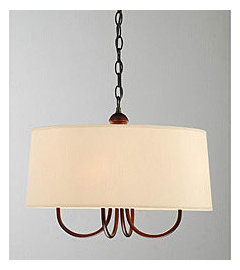 Without spending hours searching through lighting sites, here's a quick find from LightingDirect. It has a traditional look that won't be at odds with the style and period of your kitchen and dining room. It's got enough "heft" for over the oak table, yet it's open and airy. The arms have a bit of a twist to add interest. It's bronze.